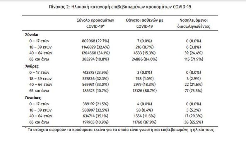 «Τα νέα εργαστηριακά επιβεβαιωμένα κρούσματα της νόσου (άτομα) που καταγράφηκαν τις τελευταίες 24 ώρες ήταν 3.928. Ο συνολικός αριθμός των ατόμων που νόσησαν ανέρχεται σε 3.410.481 (ημερήσια μεταβολή +0.1%), εκ των οποίων 48.8% άνδρες.