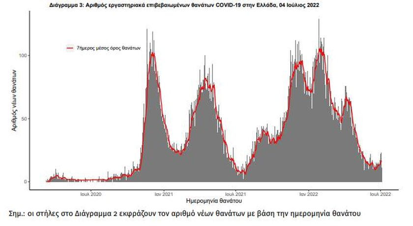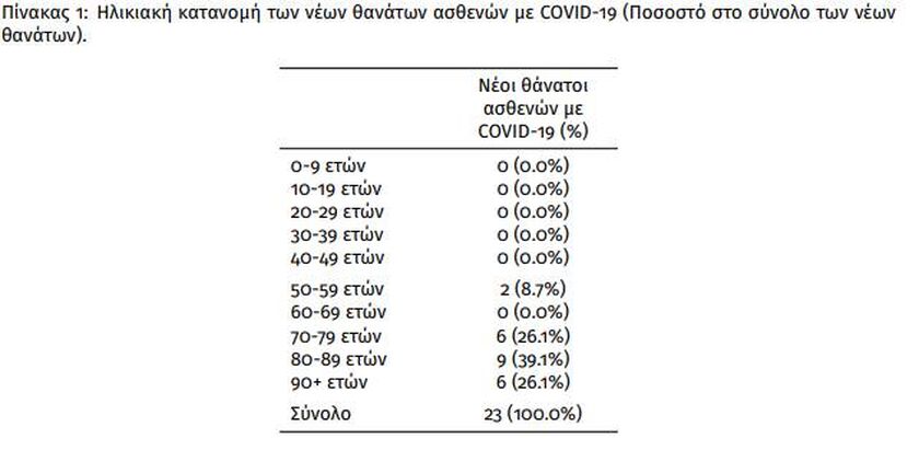 Οι νέοι θάνατοι ασθενών με COVID-19 είναι 23, ενώ από την έναρξη της επιδημίας έχουν καταγραφεί συνολικά 30.327 θάνατοι. Το 95.7% είχε υποκείμενο νόσημα ή/και ηλικία 70 ετών και άνω.