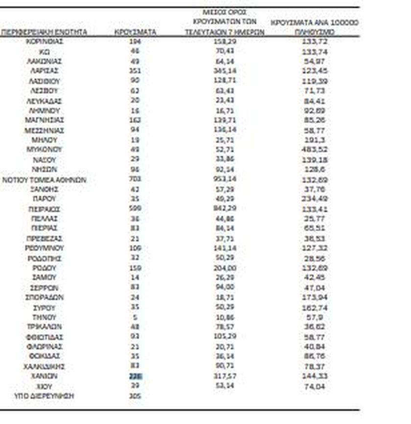 Αναλυτικά από τα συνολικά 9.360 κρούσματα σε όλη τη χώρα, τα 4.882 εντοπίστηκαν στην Αττική. Υψηλός αριθμός κρουσμάτων (971) καταγράφεται και στην Θεσσσαλονίκη αλλά και στην Κρήτη (νομοί Ηρακλείου και Χανίων), την Αχαϊα, την Κέρκυρα και τη Λάρισα.