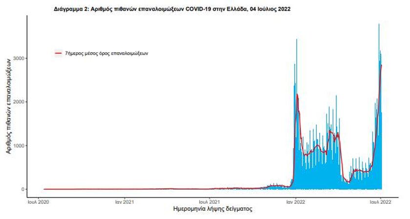 Ο αριθμός πιθανών νέων επαναλοιμώξεων που καταγράφηκαν τις τελευταίες 24 ώρες ήταν 1.841 ενώ από την αρχή της πανδημίας SARS-CoV-2 ο συνολικός αριθμός εκτιμάται σε 181.717(4.6% του συνολικού αριθμού των θετικών αποτελεσμάτων).