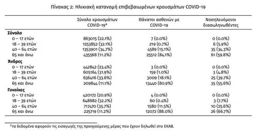 «Τα νέα εργαστηριακά επιβεβαιωμένα κρούσματα της νόσου (άτομα) που καταγράφηκαν τις τελευταίες 24 ώρες ήταν 9.360. Ο συνολικός αριθμός των ατόμων που νόσησαν ανέρχεται σε 3.729.199 (ημερήσια μεταβολή +0.2%), εκ των οποίων 48.6% άνδρες.