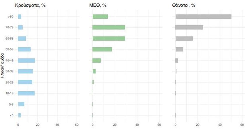 Οι εισαγωγές νέων ασθενών COVID-19 στα νοσοκομεία της επικράτειας είναι 210 (ημερήσια μεταβολή -2.78%). Ο μέσος όρος εισαγωγών του επταημέρου είναι 195 ασθενείς. Η διάμεση ηλικία των κρουσμάτων είναι 37 έτη (εύρος 0.2 έως 112 έτη), ενώ η διάμεση ηλικία των θανόντων είναι 80 έτη (εύρος 0.2 έως 106 έτη).