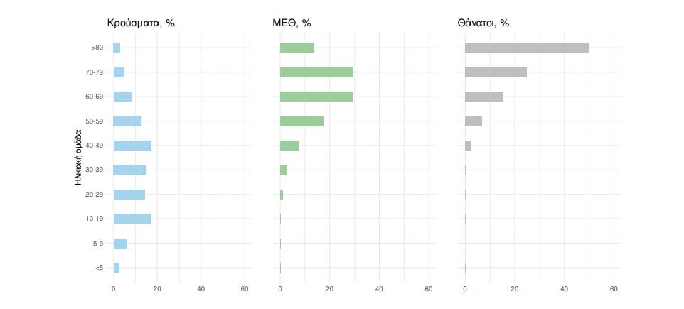 Ακολούθως παρουσιάζεται η ηλικιακή κατανομή των (α) συνολικών κρουσμάτων, (β) των περιστατικών που κατέληξαν σε θάνατο και (γ) των ασθενών που νοσηλεύονται διασωληνωμένοι: