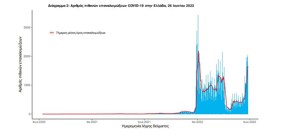 Ο αριθμός πιθανών νέων επαναλοιμώξεων που καταγράφηκαν τις τελευταίες 24 ώρες ήταν 1.592 ενώ από την αρχή της πανδημίας SARS-CoV-2 ο συνολικός αριθμός εκτιμάται σε 160.165(4.2% του συνολικού αριθμού των θετικών αποτελεσμάτων).