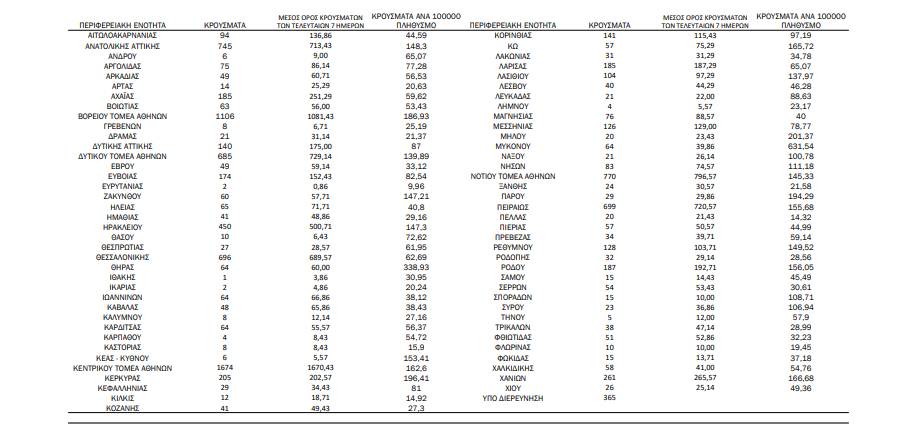 Κατανομή ανακοινωθέντων εγχώριων κρουσμάτων: Από το σύνολο των 10.886 νέων κρουσμάτων του νέου ιού στη χώρα 2 είναι εισαγόμενα. Η κατανομή των 10.884 νέων εγχώριων κρουσμάτων ανά Περιφερειακή Ενότητα παρουσιάζεται στον κατωτέρω πίνακα.