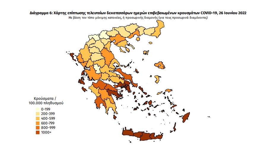 Πίνακας 3: Ημερήσιος αριθμός και κρούσματα ανά 100.000 πληθυσμού επιβεβαιωμένων εγχώριων κρουσμάτων COVID-19 ανά περιφερειακή ενότητα στις 26 Ιουνίου 2022.