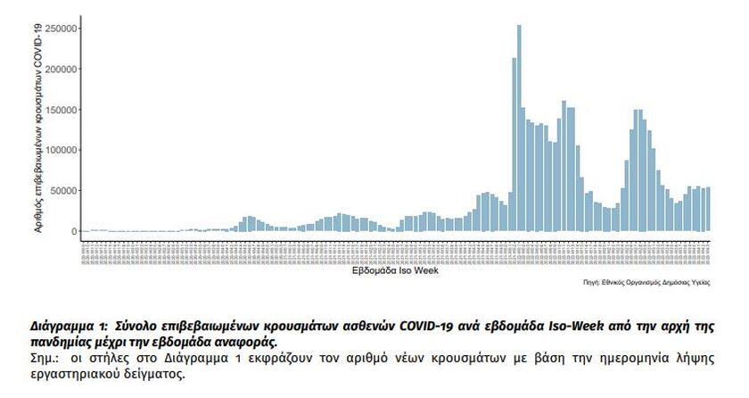 Συγκεκριμένα, εντοπίστηκαν 53.436 νέα κρούσματα και 164 θάνατους για την εβδομάδα 24 Οκτωβρίου έως 30 Οκτωβρίου 2022, ενώ σε 85 ανέρχονται οι διασωληνωμένοι ασθενείς στα νοσοκομεία της χώρας.