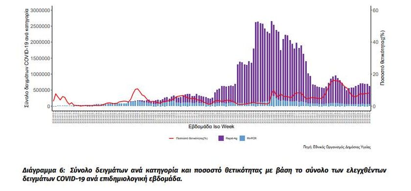 Δείγματα που έχουν ελεγχθεί: Την εβδομάδα αναφοράς, το ποσοστό θετικότητας ήταν 8,45% σε σύνολο 632.238 εργαστηριακών ελέγχων (RT-PCR/Rapid-Ag) με το μέσο όρο επταημέρου να είναι 90.320 δείγματα (-9% εβδομαδιαία μεταβολή).