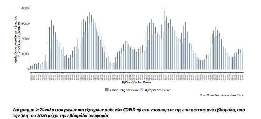 Το σύνολο των εισαγωγών, στα νοσοκομεία της επικράτειας, την εβδομάδα αναφοράς ήταν 1.324 ασθενείς (7μερος μ.ό.: 189, 3% εβδομαδιαία μεταβολή), ενώ το σύνολο των εξιτηρίων ανέρχεται σε 1.014 ασθενείς (7μερος μ.ο.: 145, -7%