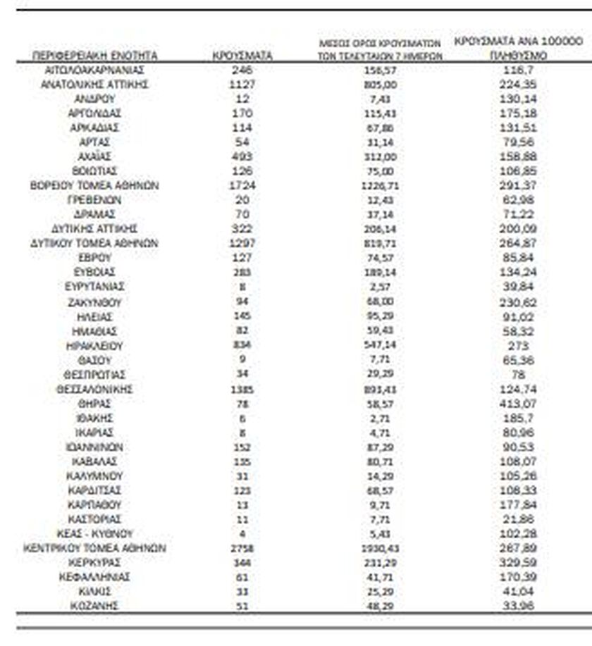 Αναλυτικά η διασπορά των κρουσμάτων κορωνοϊού σε όλη τη χώρα έχει ως εξής: