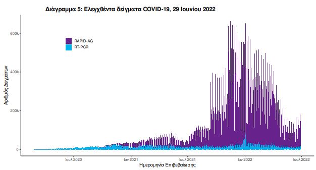 Στις 28 Ιουνίου 2022, πραγματοποιήθηκαν 181 δράσεις δειγματοληπτικών ελέγχων από τις Κινητές Ομάδες Υγείας (ΚΟΜΥ) του ΕΟΔΥ, στις οποίες διενεργήθηκαν 13.462 έλεγχοι Rapid Ag και ανευρέθηκαν 2.226 θετικά (16.54%).