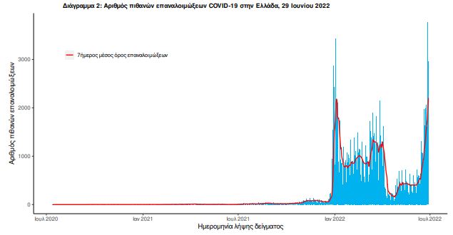 Ο αριθμός πιθανών νέων επαναλοιμώξεων που καταγράφηκαν τις τελευταίες 24 ώρες ήταν 3.023 ενώ από την αρχή της πανδημίας SARS-CoV-2 ο συνολικός αριθμός εκτιμάται σε 168.440(4.4% του συνολικού αριθμού των θετικών αποτελεσμάτων).