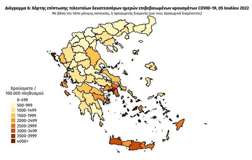 Μεγάλη είναι και η διασπορά σε αρκετές περιοχές της Ελλάδας όπως στην Κρήτη (νομός Ηρακλείου 943 και Χανίων 556), στην αχαϊα με 797 κρούσματα, την Εύβοια (523), τα Ιωάννινα (400), την Κέρκυρα (531), τη Λάρισα (916 ) και τη Ρόδο (440).