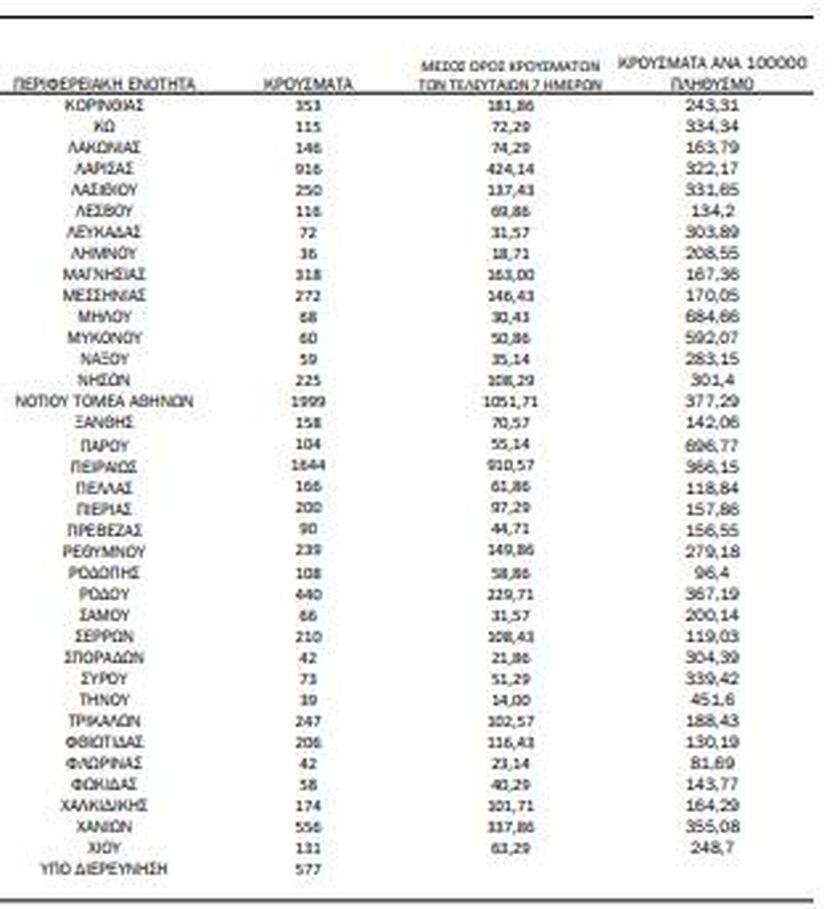 Αναλυτικά η κατανομή των κρουσμάτων, περιγράφεται στον πίνακα του ΕΟΔΥ ως εξής: