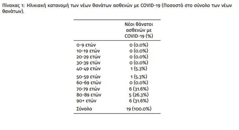 Οι νέοι θάνατοι ασθενών με COVID-19 είναι 19, ενώ από την έναρξη της επιδημίας έχουν καταγραφεί συνολικά 30.349 θάνατοι. 2 Το 95.7% είχε υποκείμενο νόσημα ή/και ηλικία 70 ετών και άνω.