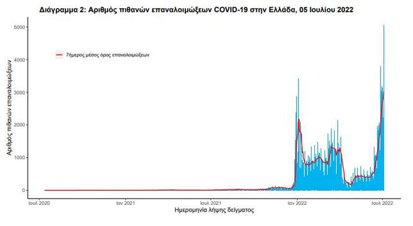 Ο αριθμός πιθανών νέων επαναλοιμώξεων που καταγράφηκαν τις τελευταίες 24 ώρες ήταν 5.022 ενώ από την αρχή της πανδημίας SARS-CoV-2 ο συνολικός αριθμός εκτιμάται σε 187.202(4.7% του συνολικού αριθμού των θετικών αποτελεσμάτων).