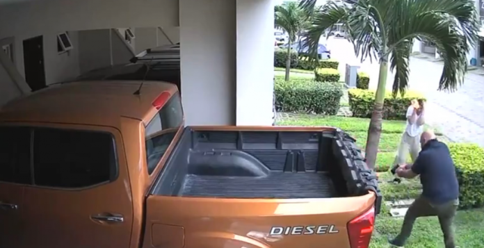 Το σοκαριστικό βίντεο δείχνει μία γυναίκα να βγαίνει από το γκαράζ και να φωνάζει στους γείτονές της από το διπλανό σπίτι. Εκείνη τη στιγμή στο πλάνο μπαίνει ένα ακόμα άτομο, που κατέληξε να είναι το θύμα του καυγά.