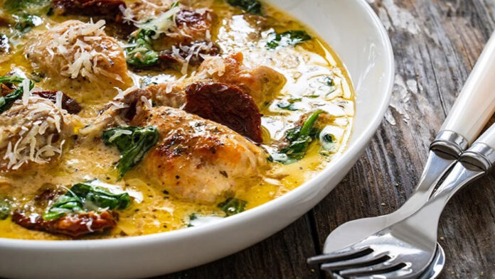 Κοτόπουλο με κρεμώδη σάλτσα με σπανάκι