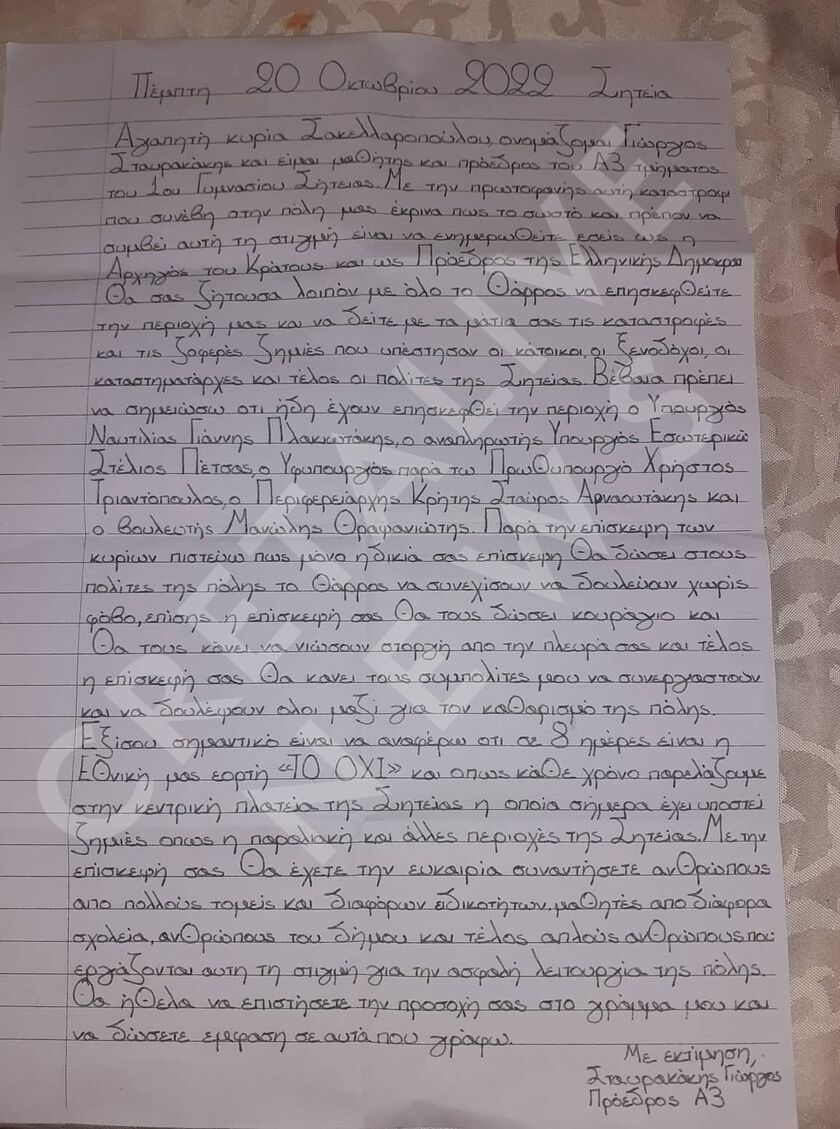 «Αγαπητή κυρία Σακελλαροπούλου, ονομάζομαι Γιώργος Σταυρακάκης και είμαι μαθητής και πρόεδρος του Α3 τμήματος του 1ου Γυμνασίου Σητείας. Με την πρωτοφανή αυτή καταστροφή που συνέβη στην πόλη μας έκρινα πως το σωστό και πρέπον να συμβεί αυτή τη στιγμή είναι να ενημερωθείτε εσείς ως η Αρχηγός του Κράτους και ως Πρόεδρος της Ελληνικής Δημοκρατίας.