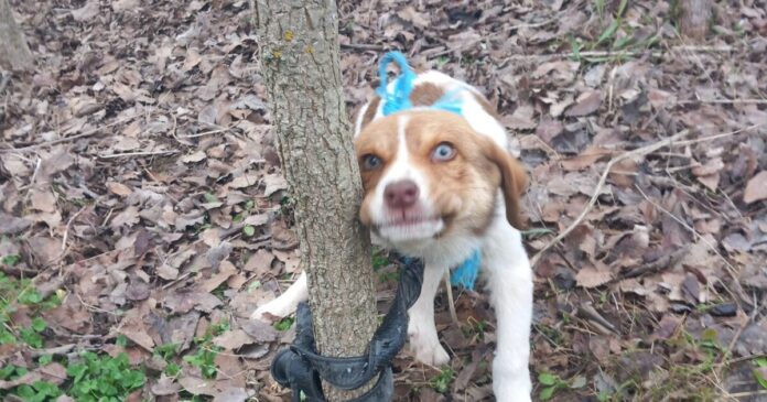 Λίγο αργότερα έφτασαν στο σημείο εθελοντές, οι οποίοι ήρθαν αντιμέτωποι με μια ιδιαίτερα σκληρή εικόνα: το κουτάβι ήταν δεμένο στον κορμό με αντρική ζώνη, ενώ γύρω από τον λαιμό του υπήρχε σχοινί που του άφηνε ελάχιστο περιθώριο κίνησης. Επιπλέον, το μπροστινό δεξί πόδι του ήταν δεμένο μαζί με το πίσω αριστερό, γεγονός που το κρατούσε σχεδόν εντελώς ακινητοποιημένο.