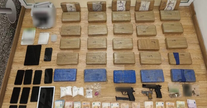 Στο πλαίσιο της επιχείρησης, δύο από τα μέλη της εγκληματικής οργάνωσης εντοπίστηκαν στο Κερατσίνι να κατέχουν από κοινού και για λογαριασμό των υπολοίπων μελών, με σκοπό την περαιτέρω διακίνηση, 30 αυτοσχέδιες νάιλον συσκευασίες τυλιγμένες με κολλητική ταινία, που περιείχαν περισσότερα από 33 κιλά κοκαΐνης, ποσότητα την οποία είχαν αφαιρέσει από εμπορευματοκιβώτιο πλοίου.