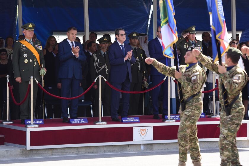 Τον χαιρετισμό της δέχθηκε ο Πρόεδρος της Δημοκρατίας, πλαισιωμένος από τον Υπουργό Άμυνας κ. Χαράλαμπο Πετρίδη και τον Αρχηγό της Εθνικής Φρουράς Αντιστράτηγο Δημόκριτο Ζερβάκη.