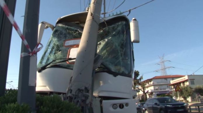 Από την σφορδρή σύγκρουση έχει μετατοπιστεί κατά δύο μέτρα η κολόνα, ενώ έχει πέσει πάνω στο πούλμαν.