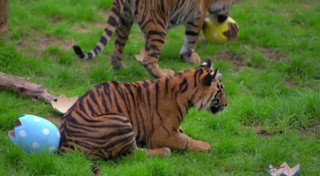«Τα μόλις εννέα μηνών τιγράκια μύριζαν τα αυγά με άρωμα κανέλας και οι σουρικάτες πήραν δώρα αυγά γεμάτα με βρύα και γρύλους», είπε η παρουσιάστρια.