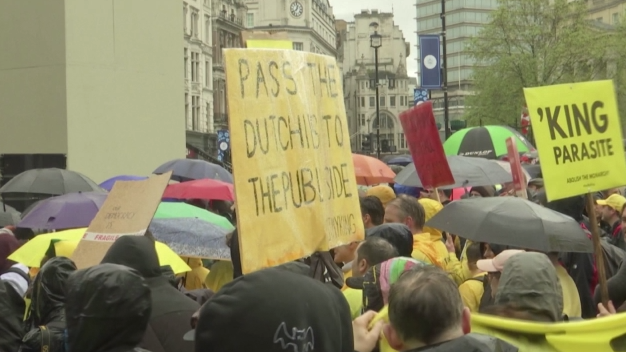 Mερικές εκατοντάδες οι διαδηλωτές κατά της μοναρχίας έκαναν αισθητή την παρουσία τους φωνάζοντας συνθήματα και κρατώντας πλακάτ στην περιοχή της πλατείας Τραφάλγκαρ, καθώς περνούσε η βασιλική άμαξα.