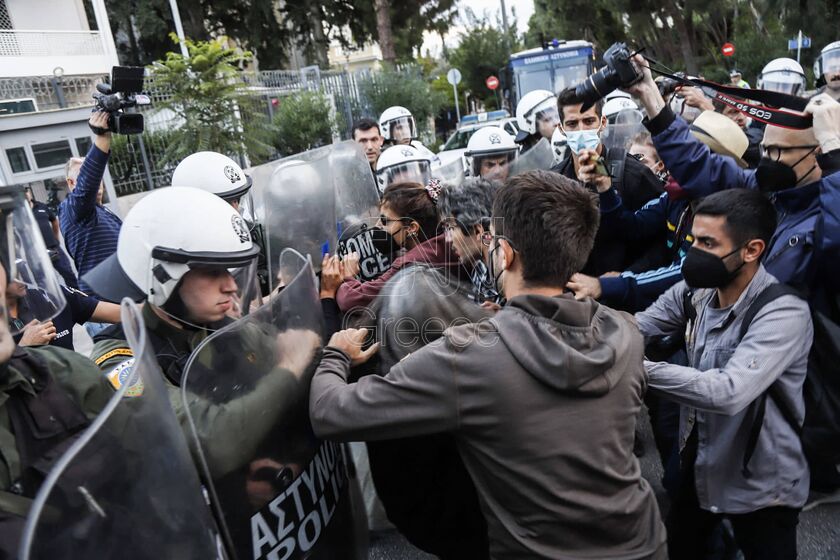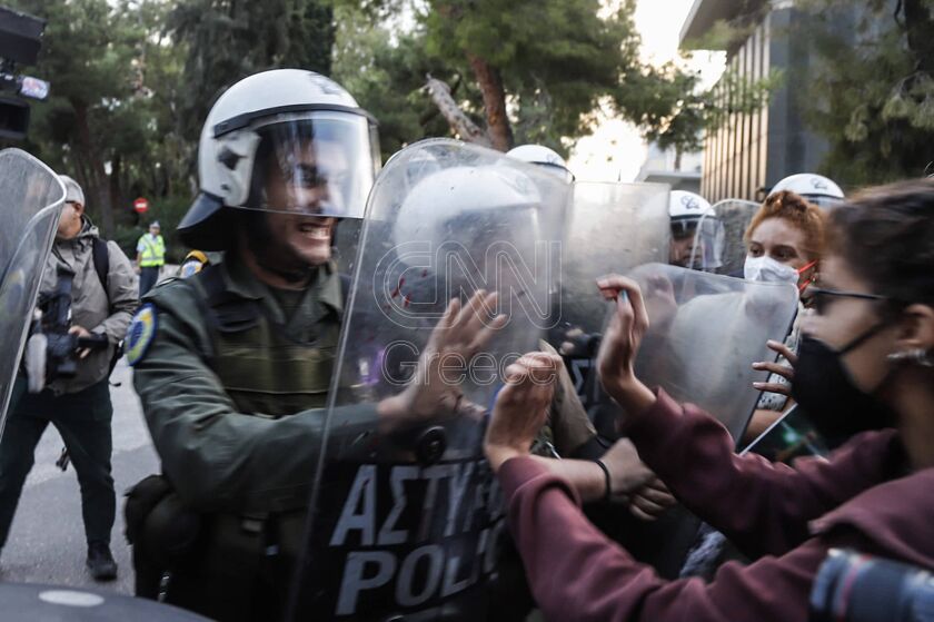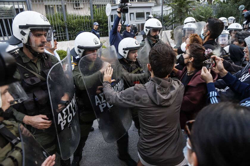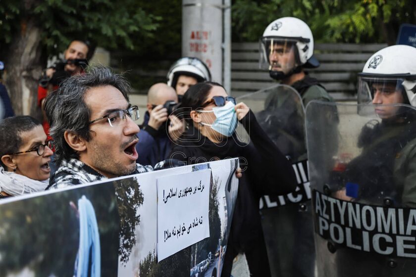 Μικρή ένταση προκλήθηκε όταν οι δυνάμεις των ΜΑΤ επιχείρησαν να αποτρέψουν τους διαδηλωτές από το να πλησιάσουν τα κάγκελα της ιρανικής πρεσβείας.