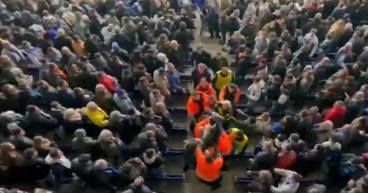 Για άγνωστο λόγο, ο συγκεκριμένος οπαδός ήταν σε έξαλλη κατάσταση και επιστρατεύτηκαν ούτε λίγο ούτε πολύ 7 άνδρες της ασφάλειας του γηπέδου (με πορτοκαλί και κίτρινα γιλέκα) για να απομακρύνουν τον μαινόμενο άνδρα .