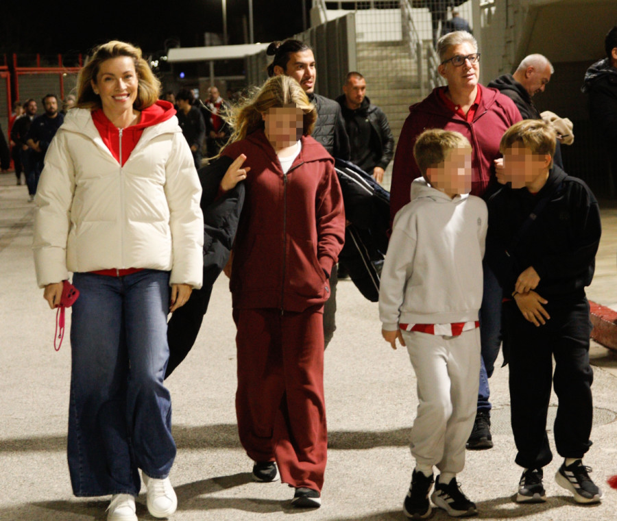 Στο γήπεδο Καραϊσκάκη βρέθηκε την Τετάρτη 26 Νοεμβρίου η Μαριέττα Χρουσαλά με τον σύζυγό της, Λέοντα Πατίτσα και τα τρία τους παιδιά, Μάργκω, Σπύρο και Κωνσταντίνο.