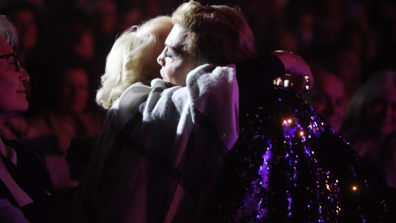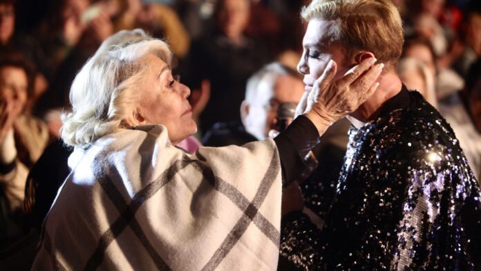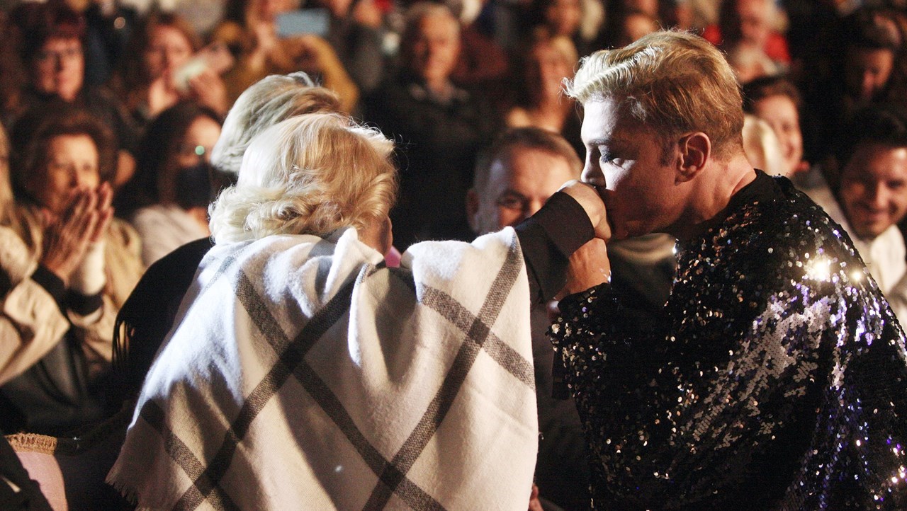 Φυσικά, η πιο συγκινητική στιγμή ήρθε όταν ο Τάκης Ζαχαράτος τραγουδώντας μεγάλη επιτυχία της Μαρινέλλας, την πλησίασε και εκείνη όχι μόνο δάκρυσε αλλά και έσπευσε να του φιλήσει τα χέρια με τον γνωστό performer να ανταποδίδει την τρυφερή χειρονομία.