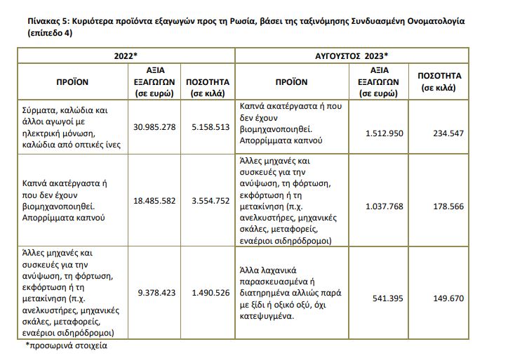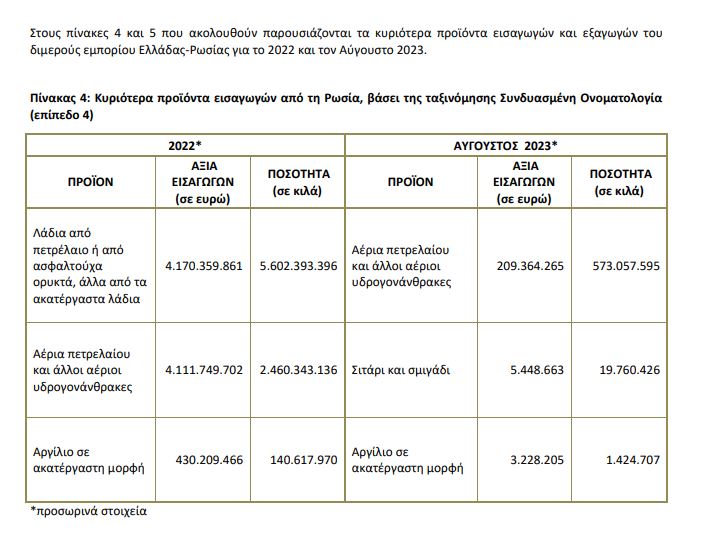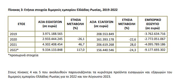 Το 8μηνο, η αξία των εισαγωγών της Ελλάδας από τη Ρωσία ανήλθε σε 1.992,7 εκατ. ευρώ, σημειώνοντας μείωση 66,5% σε σχέση με την περίοδο Ιανουαρίου- Αυγούστου 2022 που ήταν 5.737,9 εκατ. ευρώ. Ενώ, η αξία των εξαγωγών της Ελλάδας προς τη Ρωσία ανήλθε σε 66,7 εκατ. ευρώ, σημειώνοντας μείωση 14,5% σε σχέση με την περίοδο Ιανουαρίου- Αυγούστου 2022 που ήταν 78 εκατ. ευρώ. Το εμπορικό ισοζύγιο Ελλάδας- Ρωσίας ήταν αρνητικό και ανήλθε σε 1.856 εκατ. ευρώ (έλλειμμα).