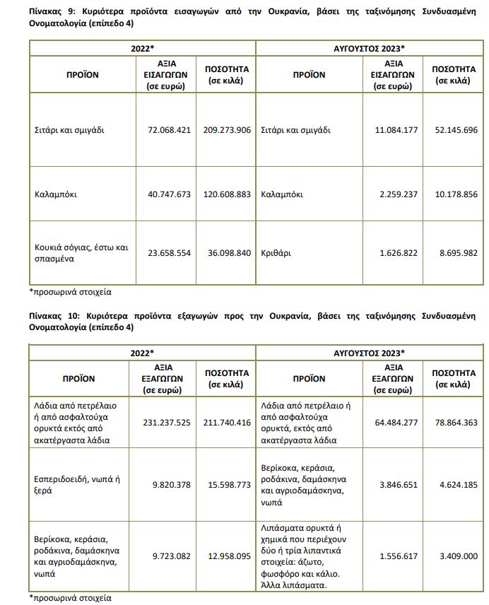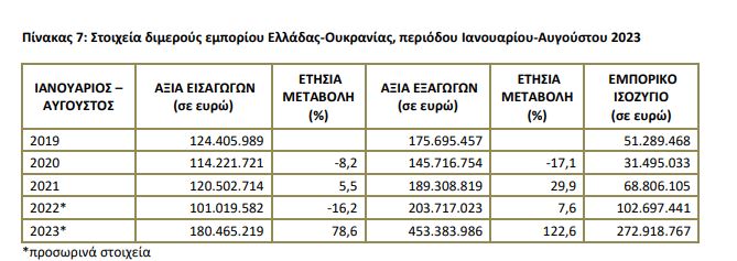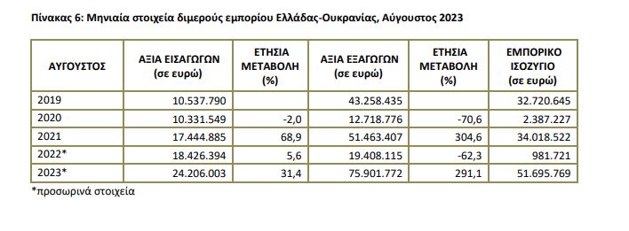 Στον αντίποδα, σύμφωνα με την ΕΛΣΤΑΤ, το εμπορικό ισοζύγιο Ελλάδας- Ουκρανίας ήταν πλεονασματικό και τον Αύγουστο και ανήλθε σε 51,7 εκατ. ευρώ. Ειδικότερα, η αξία των εισαγωγών της Ελλάδας από την Ουκρανία ανήλθε σε 24,2 εκατ. ευρώ, σημειώνοντας αύξηση 31,4% σε σχέση με τον Αύγουστο 2022 που ήταν 18,4 εκατ. ευρώ. Η αξία των εξαγωγών της Ελλάδας προς την Ουκρανία ανήλθε σε 75,9 εκατ. ευρώ, σημειώνοντας αύξηση 291,1% σε σχέση με τον Αύγουστο 2022 που ήταν 19,4 εκατ. ευρώ.