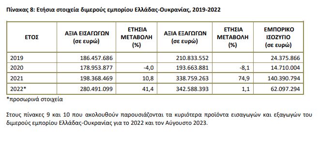 Το 8μηνο, η αξία των εισαγωγών της Ελλάδας από την Ουκρανία ανήλθε σε 180,5 εκατ. ευρώ, σημειώνοντας αύξηση 78,6% σε σχέση με την περίοδο Ιανουαρίου- Αυγούστου 2022 που ήταν 101 εκατ. ευρώ. Η αξία των εξαγωγών της Ελλάδας προς την Ουκρανία ανήλθε σε 453,4 εκατ. ευρώ, σημειώνοντας αύξηση 122,6% σε σχέση με την περίοδο Ιανουαρίου- Αυγούστου 2022 που ήταν 203,7 εκατ. ευρώ. Το εμπορικό ισοζύγιο Ελλάδας- Ουκρανίας ήταν θετικό και ανήλθε σε 272,9 εκατ. ευρώ (πλεόνασμα).