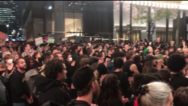 Κάποιοι διαδηλωτές κατάφεραν να μπουν στο εμβληματικό κτίριο του Grand Central. Κρέμασαν πανό με το μήνυμα «Ποτέ ξανά για κανέναν» και δεν σταμάτησαν να φωνάζουν συνθήματα κατά του πολέμου ακόμα και όταν αστυνομικοί άρχισαν να τους συλλαμβάνουν.