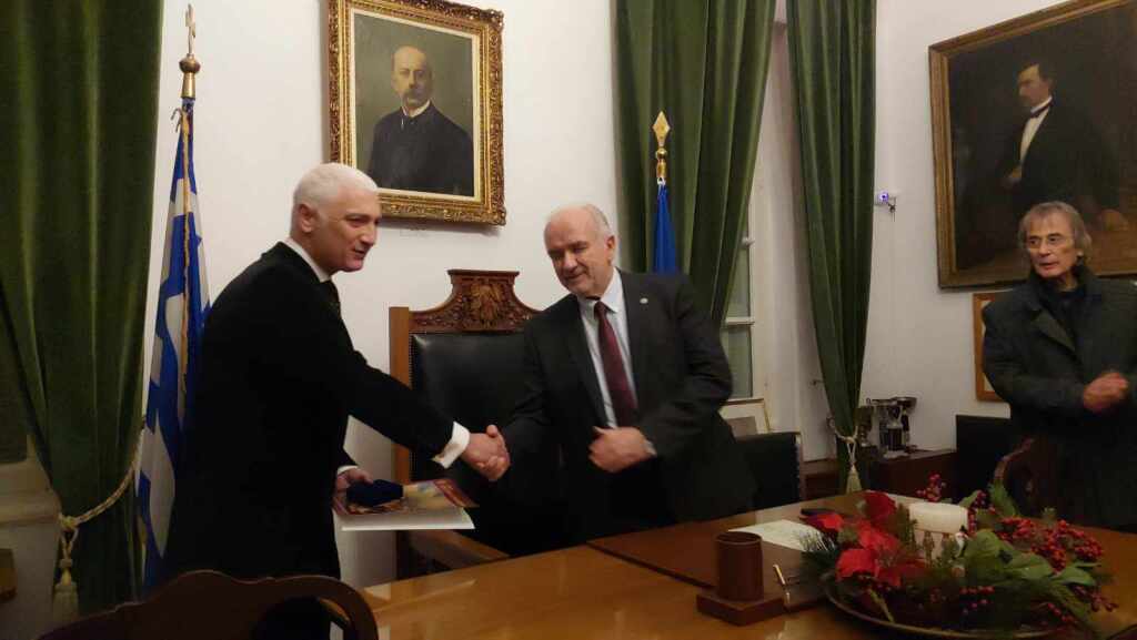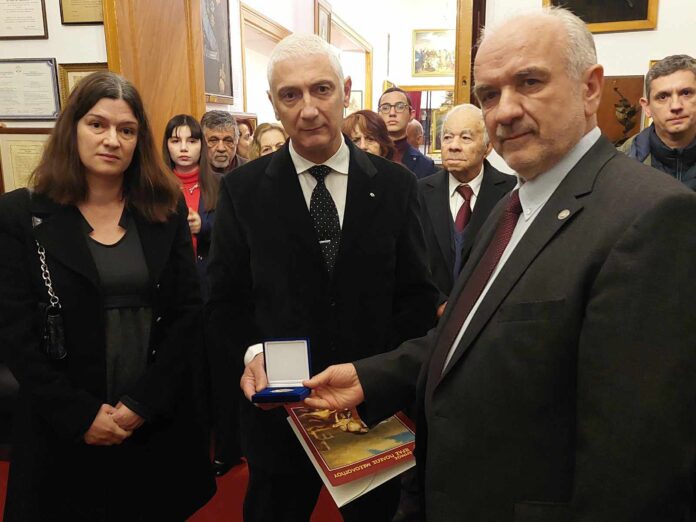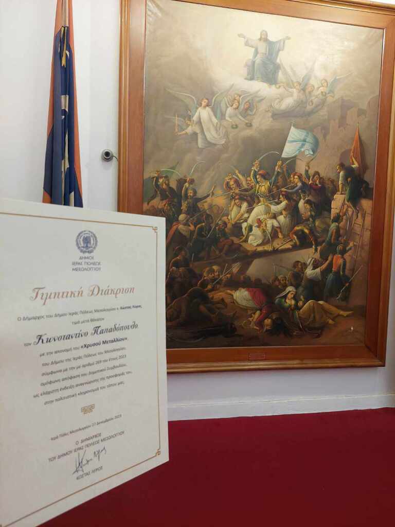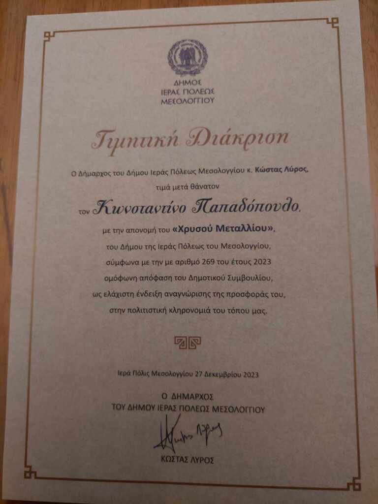 Στη Δημοτική Πινακοθήκη Μεσολογγίου, σε μια λιτή αλλά συγκινητική εκδήλωση, πραγματοποιήθηκε χθες το απόγευμα, Τετάρτη 27 Δεκεμβρίου 2023,  η τελετή απονομής του «Χρυσού Μεταλλίου» του Δήμου της Ιεράς Πόλεως Μεσολογγίου, μετά θάνατον, στον αείμνηστο Κωνσταντίνο Παπαδόπουλο, μετά και  την ομόφωνη απόφαση του δημοτικού συμβουλίου, ως ελάχιστη ένδειξη αναγνώρισης της προσφοράς του στην πολιτιστική κληρονομιά του τόπου μας