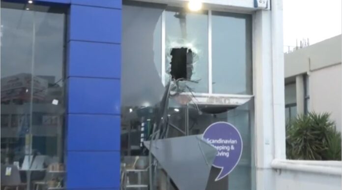 Μία τεράστια τρύπα δημιουργήθηκε στο προστατευόμενο τζάμι της πρόσοψης, ενώ οι δράστες έριξαν από τον ημιώροφο στο έδαφος.
