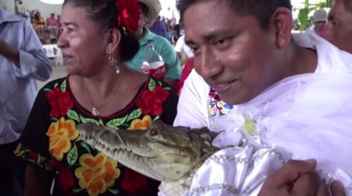 Ήταν ένας γάμος που τα είχε όλα. Μουσική, καλεσμένους, γαμπρό και αντί για νύφη, έναν θηλυκό κροκόδειλο με νυφικό.