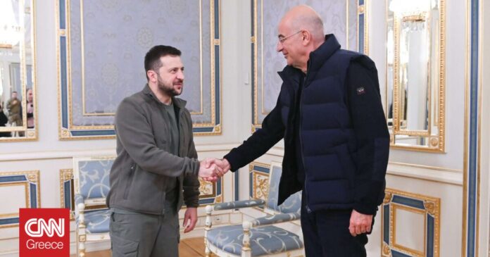 Την αμέριστη αλληλεγγύη της Αθήνας προς το Κίεβο και την απόλυτη καταδίκη κάθε απόπειρας αλλαγής συνόρων από αναθεωρητικές δυνάμεις, εξέφρασε ο Έλληνας υπουργός Εξωτερικών, Νίκος Δένδιας κατά τη συνάντησή του με τον πρόεδρο της Ουκρανίας, Βολοντίμιρ Ζελένσκι.