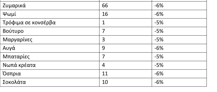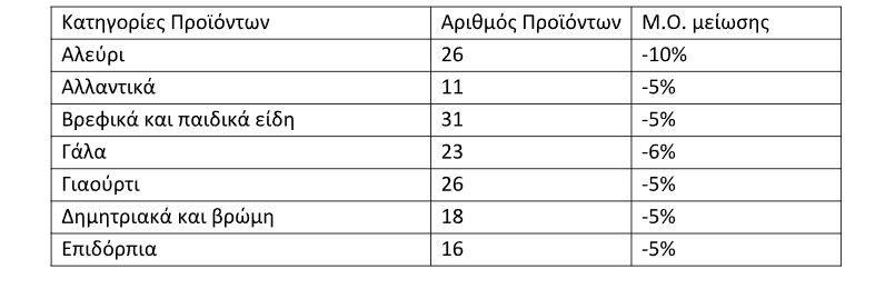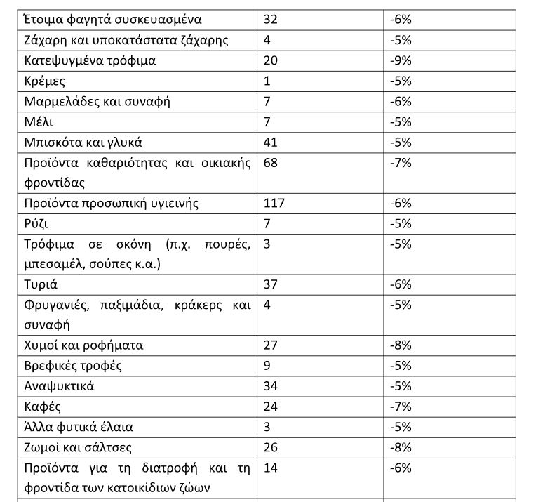 Ακολουθούν οι 37 κατηγορίες που εντάσσονται τα 770 προϊόντα καθώς και ο μέσος όρος μείωσης τιμής: