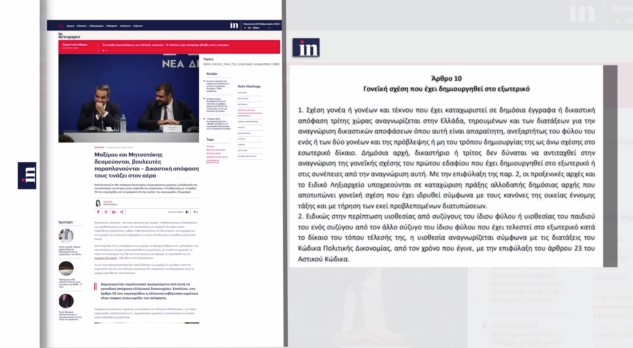 Σύμφωνα με αποκάλυψη του in.gr, το άρθρο 10 του νομοσχεδίου αναγνωρίζει τη γονεϊκή σχέση που έχει δημιουργηθεί στο εξωτερικό, ακόμη και αν αυτή προέρχεται από διαδικασία παρένθετης κύησης που έχει κινήσει άνδρας.
