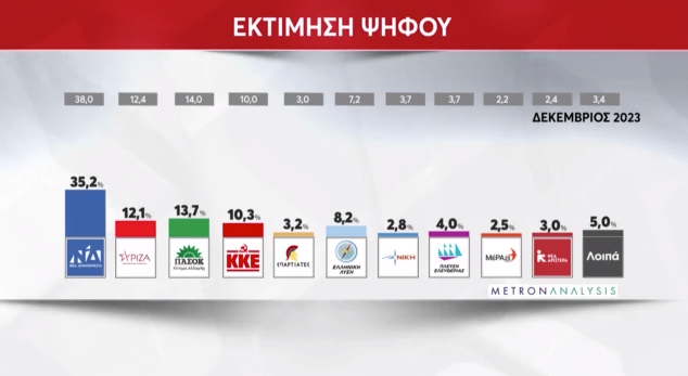 Η τελική εκτίμηση ψήφου που κάνει αυτή τη στιγμή η δημοσκόπηση της Metrion Analysis έχει τη Νέα Δημοκρατία στο 35,2%, πιο κάτω από το 38% του Δεκεμβρίου, το ΠΑΣΟΚ στο 13,7% (14% τον Δεκέμβριο), το ΣΥΡΙΖΑ να υποχωρεί στο 12,1%, το ΚΚΕ να ανεβαίνει στο 10,3%.