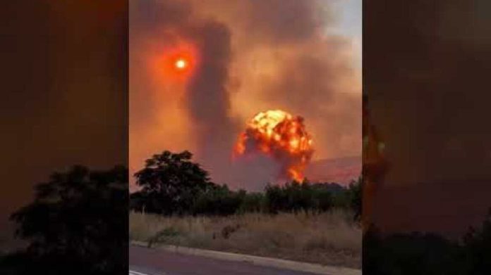 Εξαιτίας της σφοδρότητας της έκρηξης και κατ’ επέκταση του ισχυρού ωστικού κύματος που δημιουργήθηκε, υπέστει σημαντικές ζημιές το στρατόπεδο στην περιοχή Καράμπα, το οποίο λίγο νωρίτερα (περί την 17:45) είχε εκκενωθεί προκειμένου να μην υπάρξει κίνδυνος για το προσωπικό, αφού η φωτιά το είχε προσεγγίσει επικίνδυνα χωρίς να καταστεί δυνατόν να αναχαιτιστεί. Σύμφωνα με το ΓΕΑ, μετά την είσοδο της φωτιάς στο δυτικό τμήμα του στρατοπέδου ακούστηκαν εκρήξεις διαφόρων εντάσεων, ενώ την 19:18 σημειώθηκε ισχυρή έκρηξη. Λόγω των εκρήξεων η Ελληνική Αστυνομία δημιούργησε περίμετρο ασφαλείας στα 3 χιλιόμετρα πέριξ του στρατοπέδου και εκπέμφθηκε σχετικό σήμα από το 112 την 19:50.