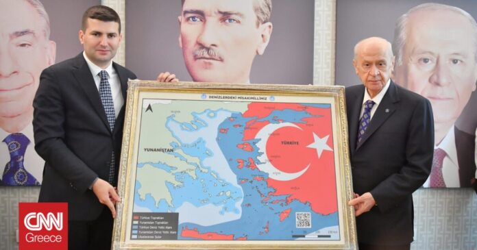 Προκλήσεων συνέχεια από την Τουρκία με τον ηγέτη των Γκρίζων Λύκων και πολιτικό εταίρο του προέδρου Ρετζέπ Ταγίπ Ερντογάν, Ντεβλέτ Μπαχτσελί, να φωτογραφίζεται στην έδρα της εθνικιστικής οργάνωσης με χάρτη, στον οποίο τα περισσότερα νησιά του Αιγαίου, καθώς και η Κρήτη, απεικονίζονται ως τουρκική επικράτεια. Μόλις λίγες ώρες νωρίτερα, ο Τούρκος υπουργός Άμυνας Χουλουσί Ακάρ είχε εκτοξεύσει απειλές
