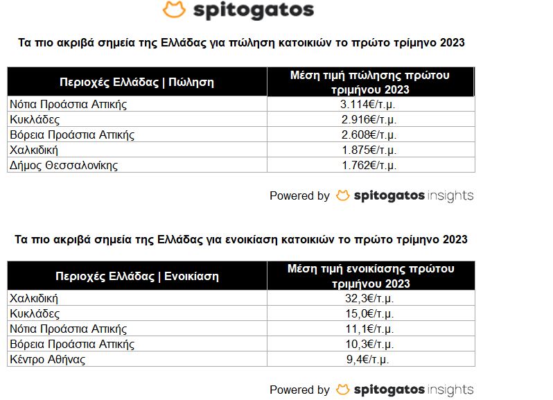 Συνολικά, στην επικράτεια οι μεγαλύτερες μεταβολές στις μέσες ζητούμενες τιμές πώλησης κατοικιών σε σχέση με το 1ο τρίμηνο 2022 παρατηρήθηκαν στην Πάρο (+24,9%), στην Καλλιθέα (Νότια Προάστια Αττικής) (+24,4%), στη Θέρμη (Δήμος Θεσσαλονίκης) (+23,1%), στο Κέντρο της Θεσσαλονίκης (+22,8%) στη Βούλα (Νότια Προάστια Αττικής) (+22,5%), στην Καλαμάτα (+22,4%) και στα Χανιά (+22,2%). Μάλιστα στα Χανιά είχαμε αύξηση +26,7% στη μέση τιμή πώλησης διαμερισμάτων σε σχέση με πέρσι, κατατάσσοντας τα στις πόλεις της Ελλάδος με τις υψηλότερες τιμές αυτών.