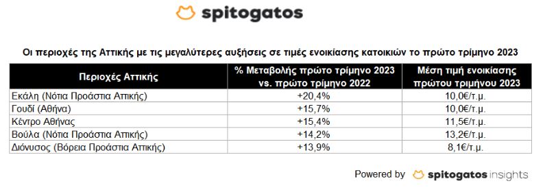 Οι μεγαλύτερες αυξήσεις σε ζητούμενες τιμές ενοικίασης κατοικιών σε σχέση με το πρώτο τρίμηνο του 2022 εμφανίστηκαν σε Ρέθυμνο (+20,0%), Κέντρο Αθήνας (+15,4%), Βούλα (+14,2%), Διόνυσο (+13,9%), Νέα Ερυθραία (+13,7%) και Σεπόλια (+13,1%).