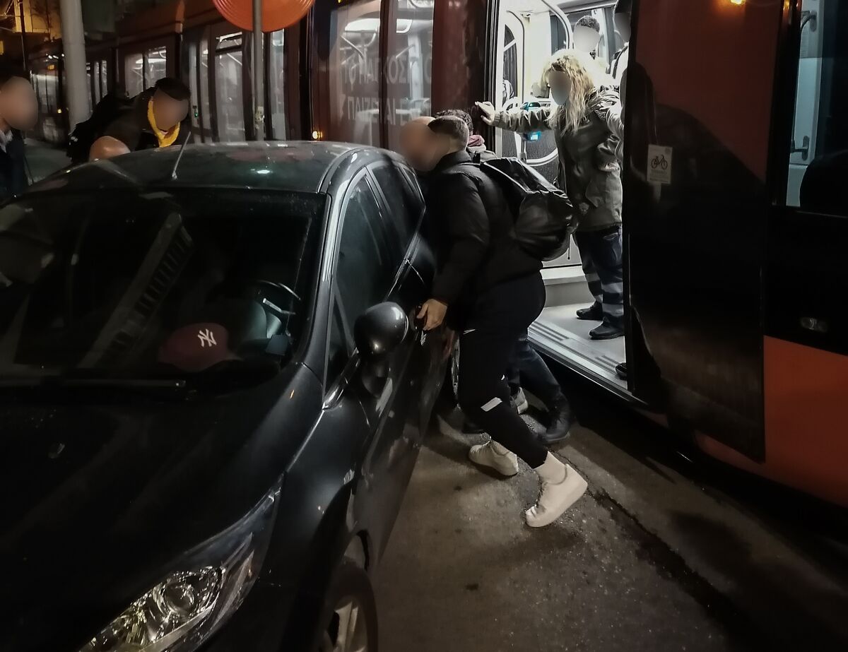 Τη λύση στο πρόβλημα και την ταλαιπωρία που δημιουργήθηκε έδωσαν επιβάτες του τραμ οι οποίοι σήκωσαν στα χέρια το αυτοκίνητο προκειμένου να το μετακινήσουν και να απεγκλωβίσουν τον συρμό.