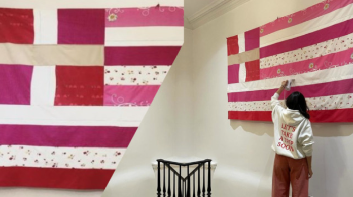 Τη ροζ ελληνική σημαία από σεντόνια κακοποιημένων γυναικών φιλοτέχνησε η Γεωργία Λαλέ, που ζει μόνιμα στη Νέα Υόρκη.